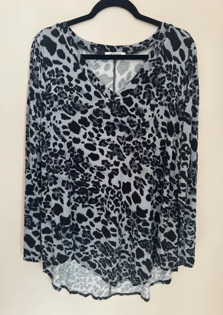 Zenana women’s long sleeve v-neck animal print tunic top in a size XL. Has a relaxed and flowy fit. Style # AT-45016. In excellent like new condition- no stains, holes, or flaws. Fast shipping! Flat lay measurements (approx): Pit to pit- 21” Length- 29” Zenana top, leopard print top, animal print blouse, women’s XL top, long sleeve tunic, v neck shirt, casual boutique top, boho top, fall winter top, gray leopard top