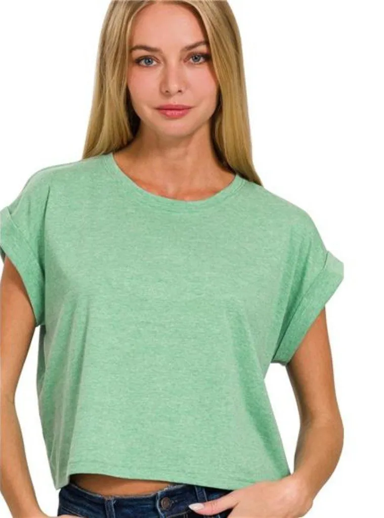 *Features:Basic style *Stretch:No stretch *Material composition:100% COTTON *Care instructions:Machine wash cold. Tumble dry low. *Imported *Product measurements: *This fashion cropped t-shirt features a comfortable relaxed fit in a refreshing mint color. Made from a soft, breathable fabric blend perfect for everyday wear. The rolled cap sleeves and classic round neckline create a casual yet stylish look. The cropped length hits at the perfect spot to pair with high-waisted bottoms. The versatile design makes it easy to dress up or down for various occasions. The stretchy material ensures comfort while maintaining its shape throughout the day. *S:Bust 34-36 in, Waist 26-28 in *M:Bust 37-38 in, Waist 29-31 in *L:Bust 39-40 in, Waist 32-33 in Style No: 10010008556