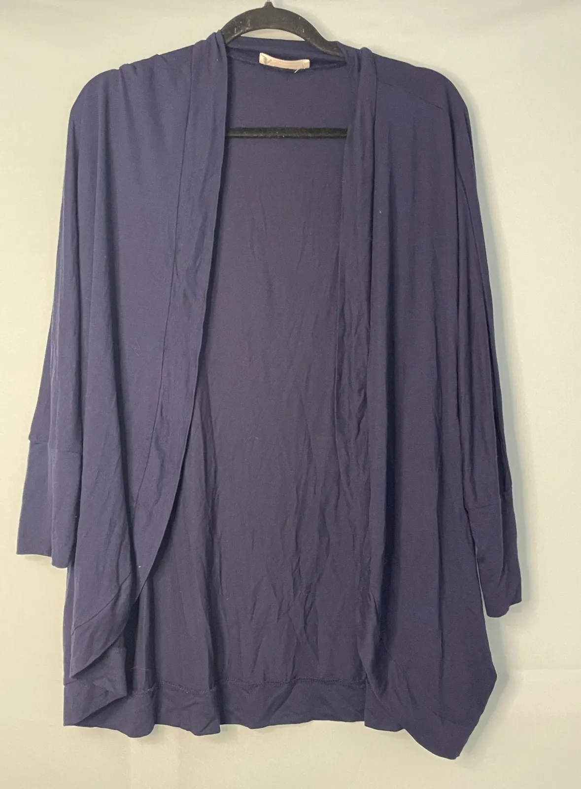 A versatile navy blue open front cardigan sweater. This knit piece features a comfortable draped sil... Show more
