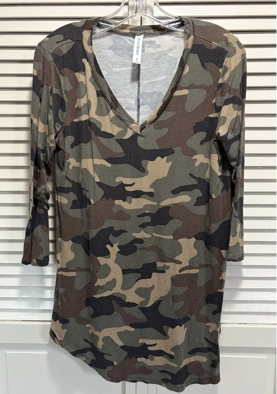 The Zenana Green Camo Long Sleeve Tunic Top in size Medium with a V-Neck design is a versatile and comfortable piece for any woman's wardrobe. It is 19" pit to pit and 31" length. Made from a soft and lightweight Jersey fabric blend of spandex and rayon, this tunic is perfect for all seasons with its breathable and stretchy material. The camouflage pattern in green, tan, and brown adds a stylish touch, while the relaxed fit ensures comfort and ease of movement. Ideal for travel and casual occasions, this top is a great addition to the collection of any fashion-forward woman. (2958)