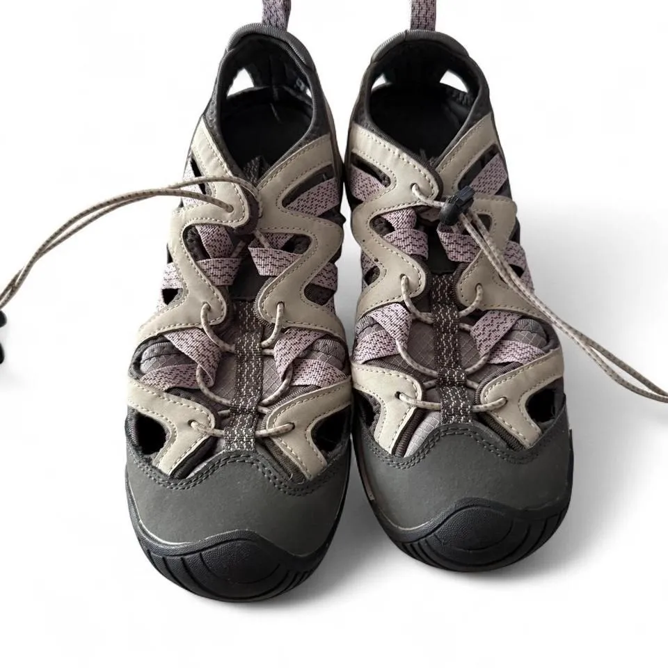 Durable Zeroxposur Umpqua River sport sandals designed for comfort, stability, and outdoor use. Closed-toe design offers added protection while breathable mesh panels keep feet cool. Features adjustable bungee lace system for a secure fit. Great for walking, travel, light hiking, water activities, or everyday casual wear. Preowned in excellent condition with minimal outsole wear. • Brand: Zeroxposur • Model: Umpqua River Sandal • Style: Closed-toe sport /outdoor sandal • Size: US 7 (UK 4.5 / EU 38 / CM 24) • Color: Gray with lavender accents • Closure: Adjustable bungee lace • Upper: Synthetic / textile • Outsole: Man-made materials zeroxposur sandals, zeroxposur umpqua river, women sport sandals, closed toe sandals women, outdoor water sandals, hiking sandals women, gray sport sandals, adjustable bungee sandals, women size 7 sandals, trail walking sandals, breathable outdoor sandals