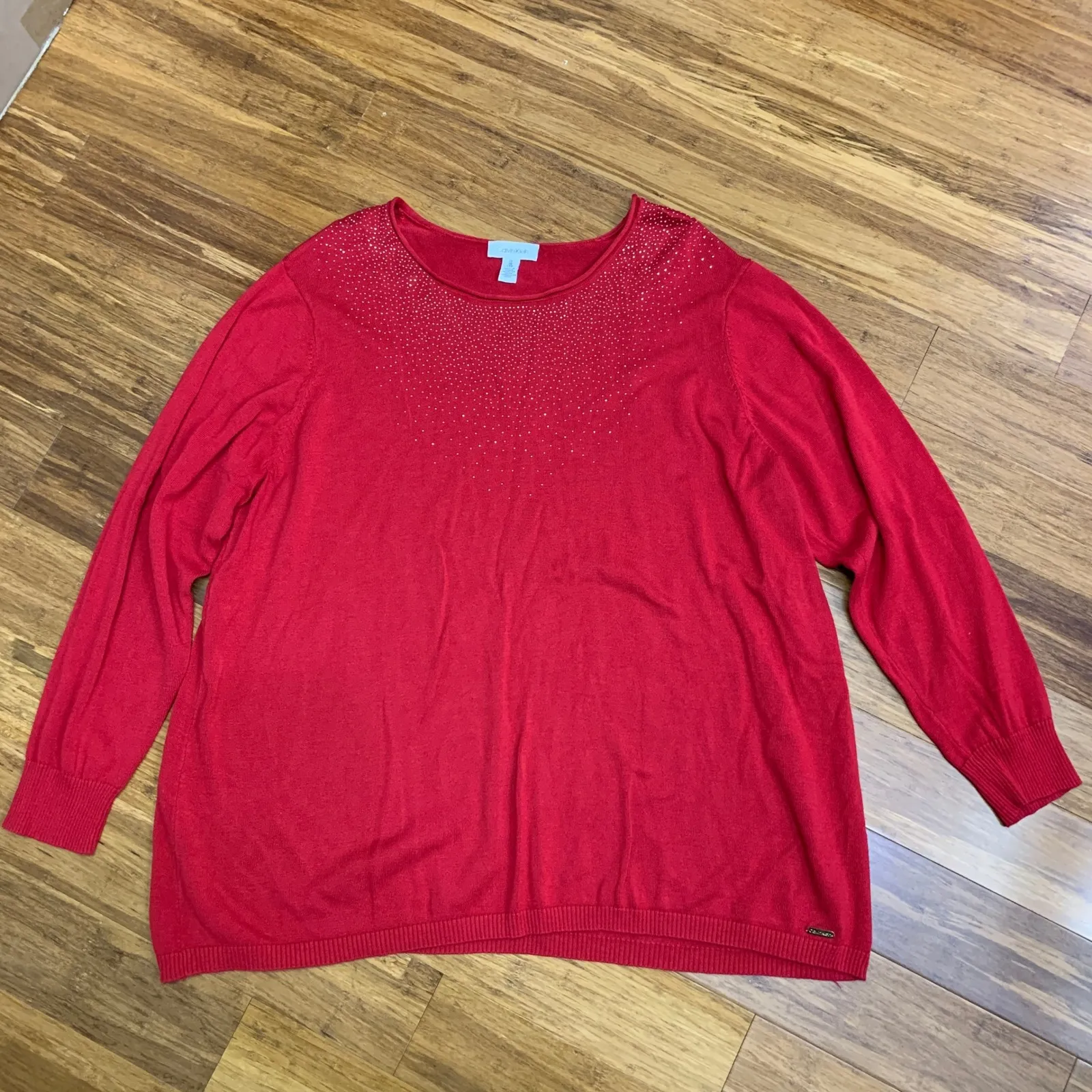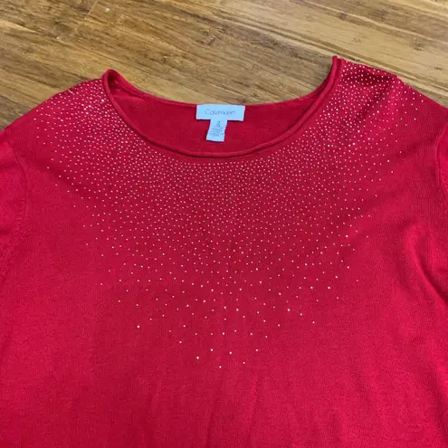 Elegant sweater by Calvin Klein featuring a vibrant red hue and eye-catching rhinestone embellishmen... Show more