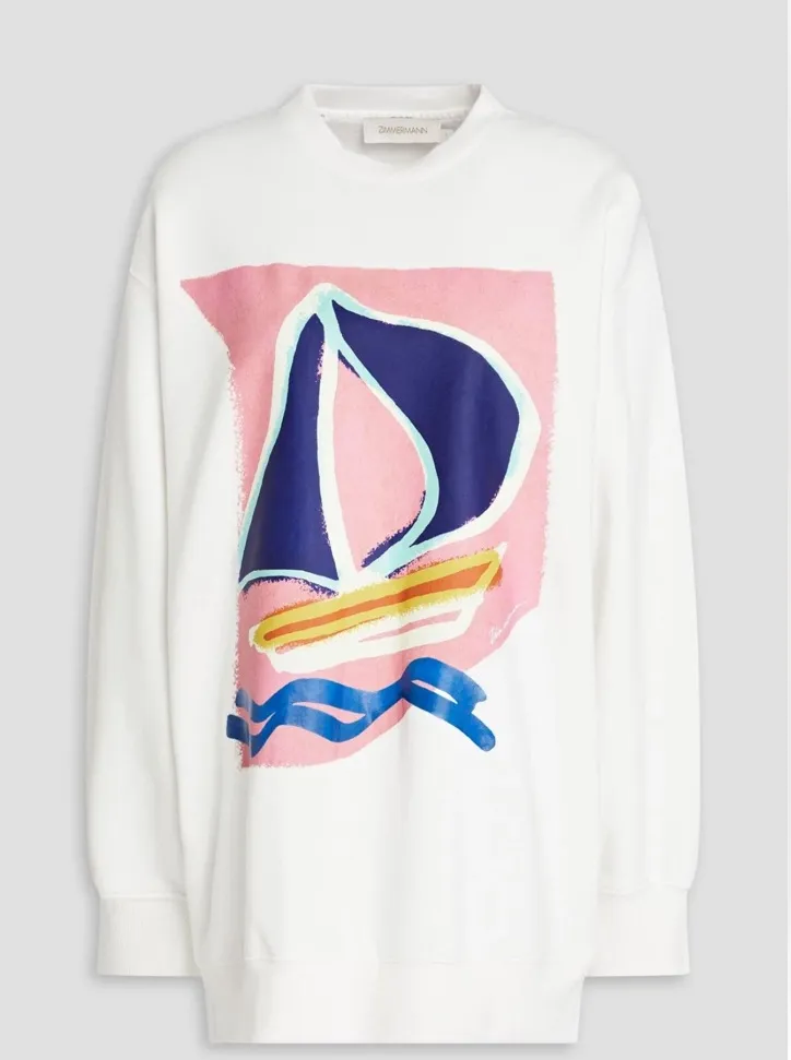 The Printed Crew Fleece in Ivory from our Resort 2023 Collection, High Tide. A cotton sweater featuring a ribbed neckline and cuffs. - A cotton fleece sweater - Ribbed cuffs and neckline - Placement print Sailboat print NWOT, Has some discoloring, can probably be washed