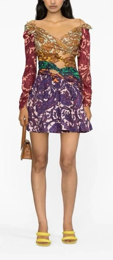 Good condition. True color shown in last photo. Size 0. A linen mini dress featuring a ruched bodice, long sleeves and asymmetric waist, finished with a spliced paisley print and bow details. - Cold-shoulder - Spliced paisley print - Front cut-outs with bow tie detail - Ruched bodice - Concealed side zip tags: summer, wedding, guest, shower, bridal, cottagecore, boho, spring, vacation, beach, sundress, sun dress, bohemian