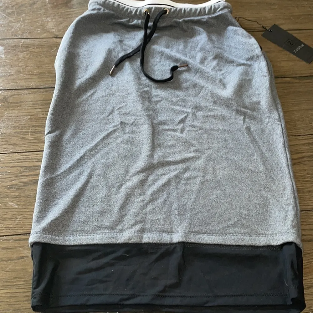 NWT Zobha Charcoal Heather French Terry size small- Leah Midi Skirt - cute underwear style band under elastic skirt with drawstring tie- black sheer layer under the hem/ sporty but can also be dressed up. ***Please note this should probably be washed in cool alone or with like colors since the dye has already transferred onto the bottom of the waistband - please see photo Approx measurements- Laying flat waist 11” Length 25”