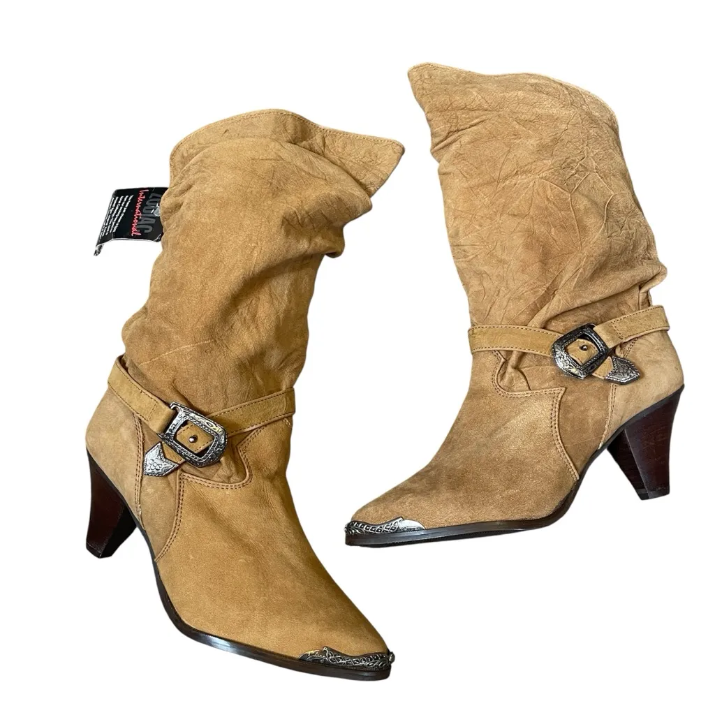 Women’s size 7.5 Heel height- 3” Does not come with box Brand new with tags! Slouch style, but can fold over top for a different look Pull on style. Still have price tag on bottom- were sold for $95 but these are still brand new vintage boots!