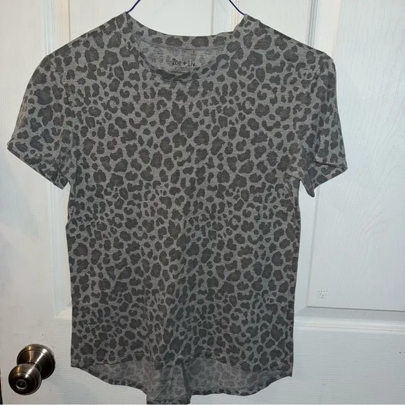 This stylish top from Zoe + Liv features a fitted design with a striking gray graphic pattern. The short sleeves and soft fabric make it a comfortable choice for everyday wear. Perfect for adding a touch of flair to your casual wardrobe.