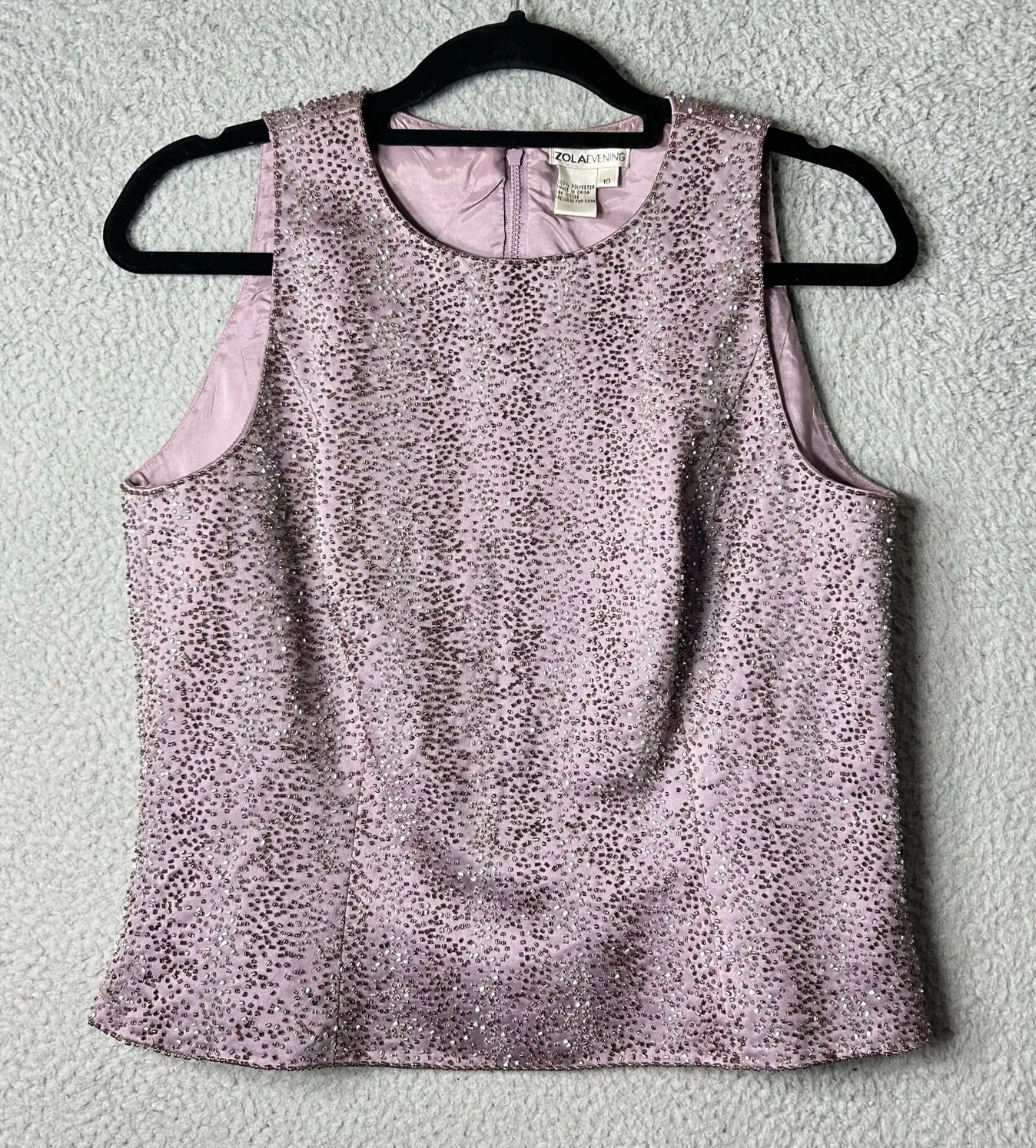 ZOLA EVENING Top Womens 10 Purple Lilac Sleeveless Sequin Top Wedding Dressy Features: Sleeveless Zip Closure Crew Neck Polyester Color: Purple (Lilac) Size: 10 Condition: Pre Owned Condition