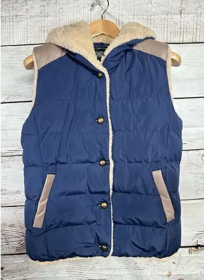 This navy blue puffer vest by Zshow is the perfect addition to your winter, fall, or spring wardrobe. The vest is made of polyester and features a fleece fabric type with a quilted design and button accents. The closure is a zipper and the vest is lined with polyester for added warmth. The vest is a size medium and has a regular fit. It is machine washable and easy to care for. The solid pattern and classic theme make it a versatile piece that can be worn for casual occasions. The vest is not handmade and was manufactured in China. New with tags vest. Soft inside great contition. Measurements chest pit to pit 20 inches across Length 25 inches long