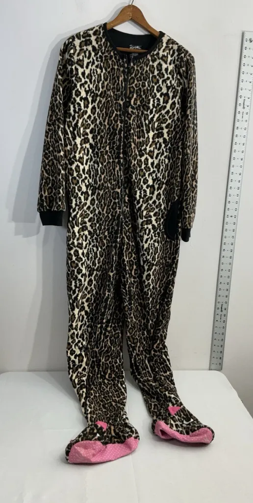 This is a women's Nick & Nora sleepwear one-piece pajama with feet in size small, featuring a stylish brown cheetah animal print pattern. The pajama has a full zip closure, long sleeves, and feet for a cozy and comfortable fit. Perfect for lounging around the house or getting a good night's sleep, this multicolored pajama combines style and comfort for a trendy addition to any sleepwear collection. Measurements; Pit to Pit 18.5” (37”) Length to ankle 55” Inseam 28” Arm Length 18.5” These pajamas are pre owned, they have a broken button on the foot but look to be in good condition!