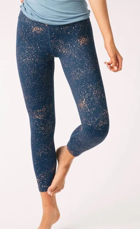 Zyia Active Stay Gold Light & Tight Speckled Crop Leggings Great used condition, size 8-10 Stylish blue leggings with a gold burst/speckled design High compression and stay put high waist Comfortable and flexible fit Stretch Pullon Crop length Color: blue/gold 73% Polyester 27% Spandex Measured flat: waist 13.75" rise 10.5" inseam 24.5" 7.3