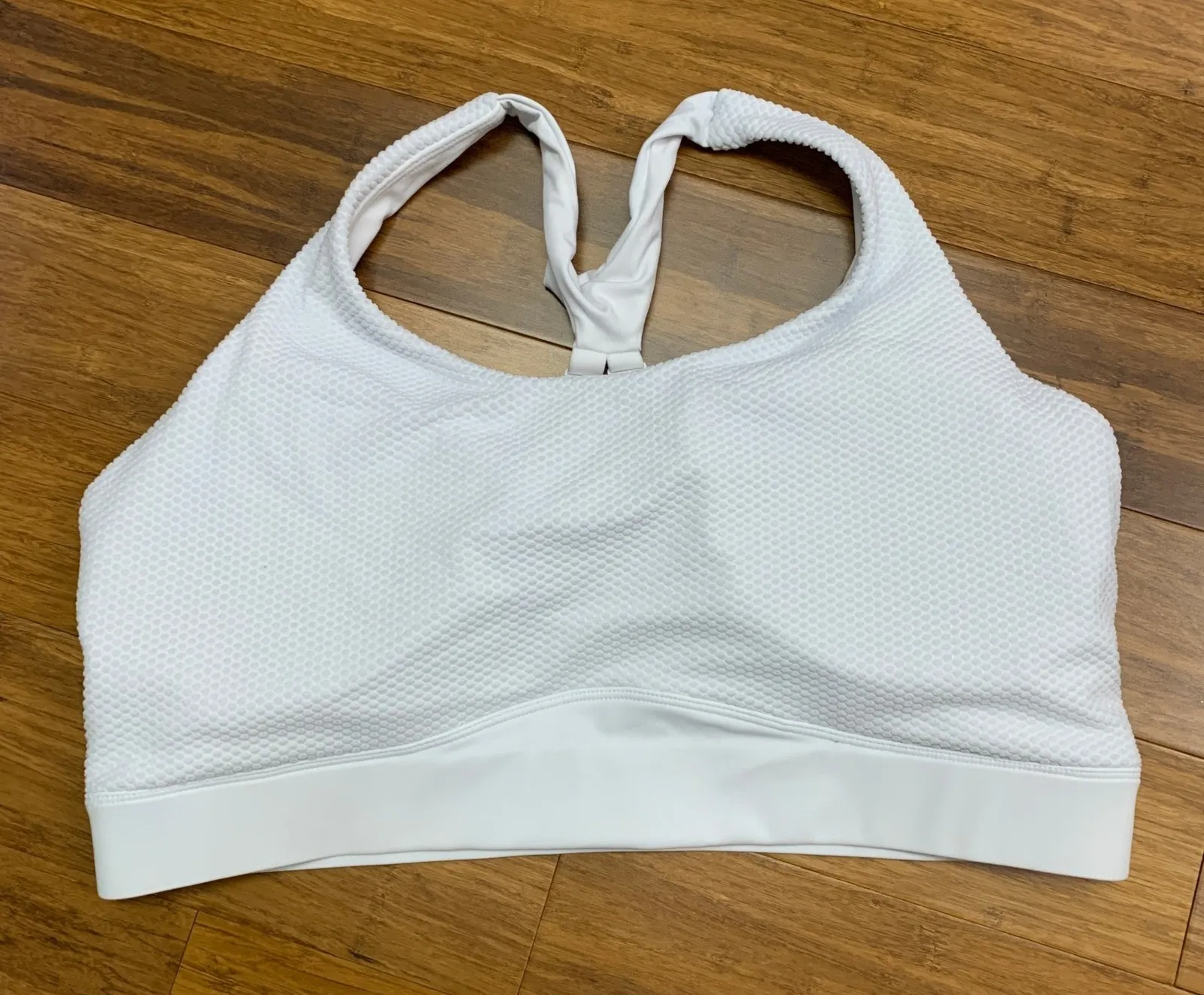 White sports bra designed for medium to high impact activities. This bra features a stylish criss cross back design, offering both support and a flattering look. The textured fabric adds a unique visual appeal, while the padded cups enhance shape and comfort. The wide underbust band ensures a secure and comfortable fit, making it ideal for workouts or everyday wear. The back features a hook and eye closure for easy on and off. Keywords: ZYIA Active, sports bra, white bra, criss cross back, textured bra, padded sports bra, workout bra, exercise bra, activewear, XXXL, plus size, supportive bra, nylon bra, running bra, gym bra Very good used condition. Open to offers!